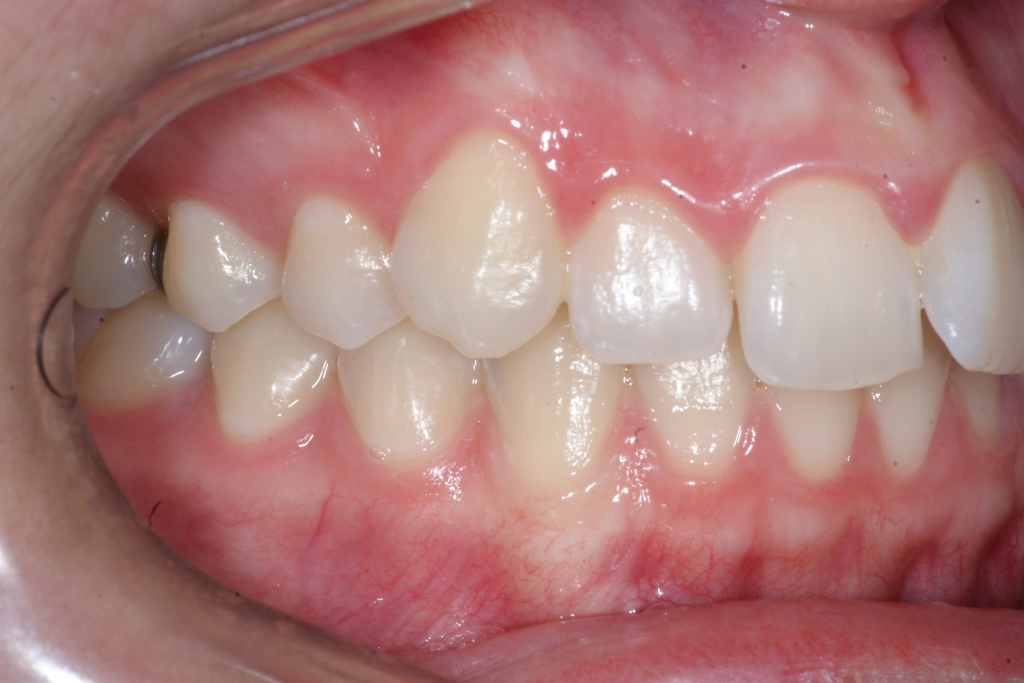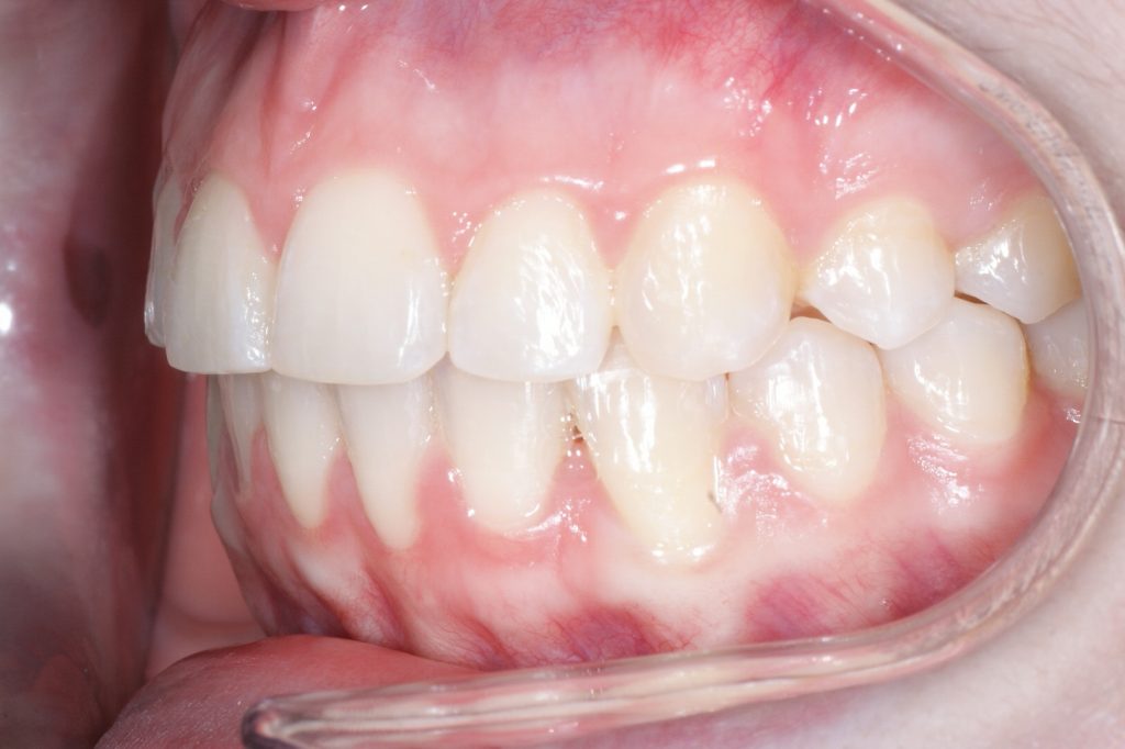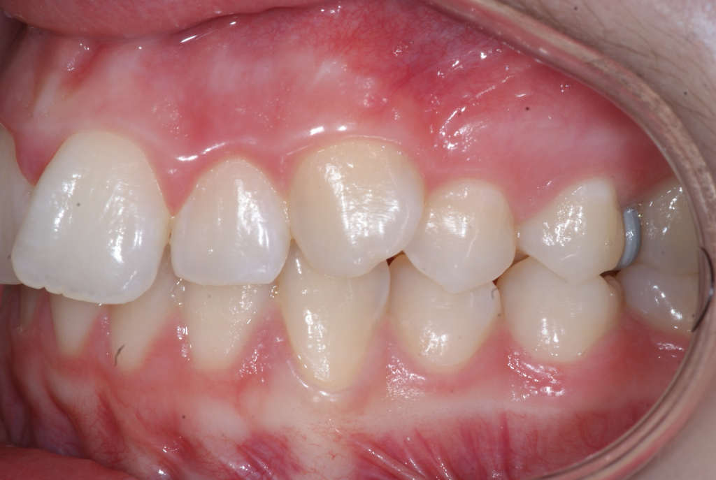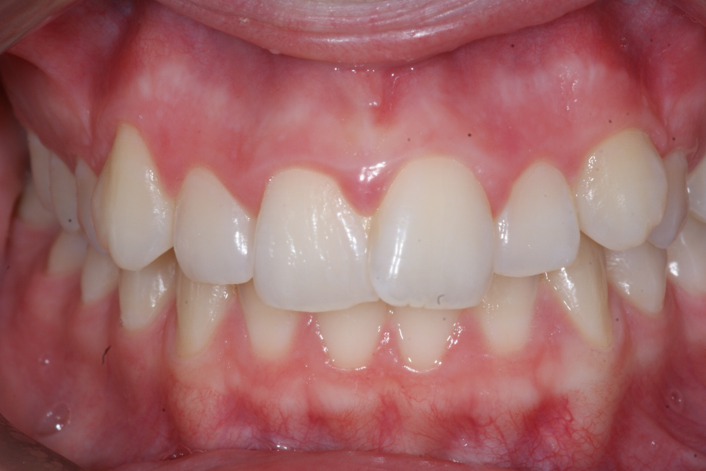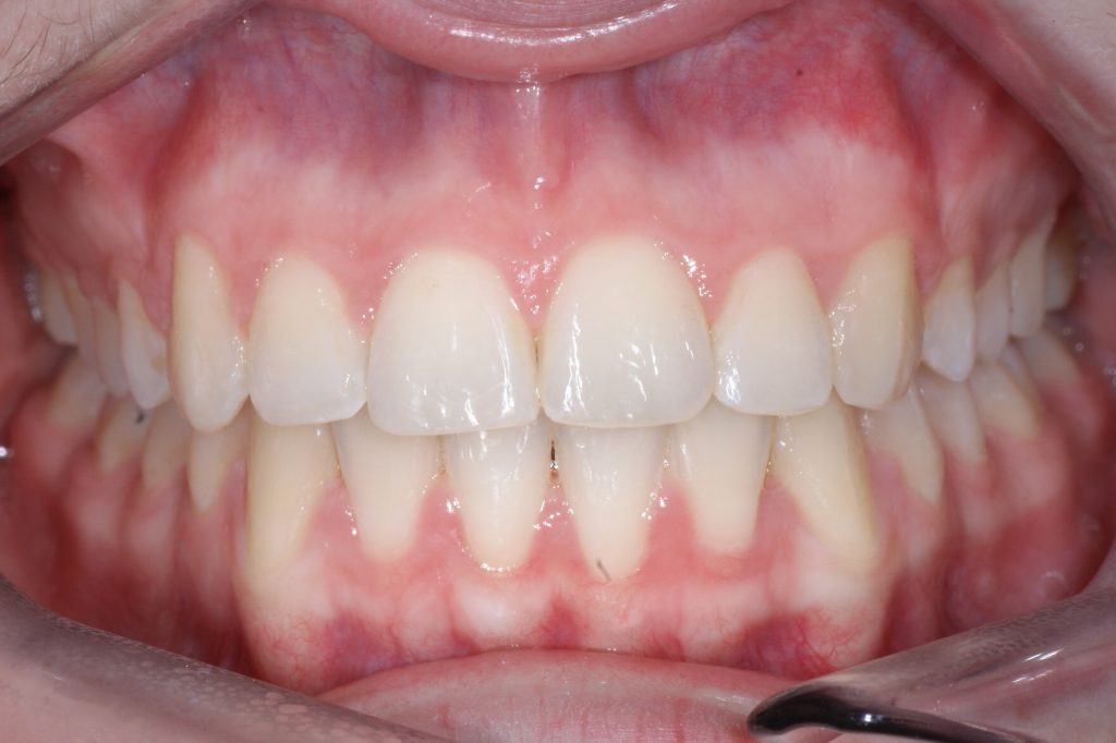 Correction d’une malocclusion de type Classe II division 1, surplomb horizontal inadéquat et chevauchement modéré aux 2 arcades. Des appareils fixes (broches et vis d’expansion) et des élastiques furent nécessaires pour améliorer ce sourire. Traitement chez une adolescente, réalisé en 18 mois.