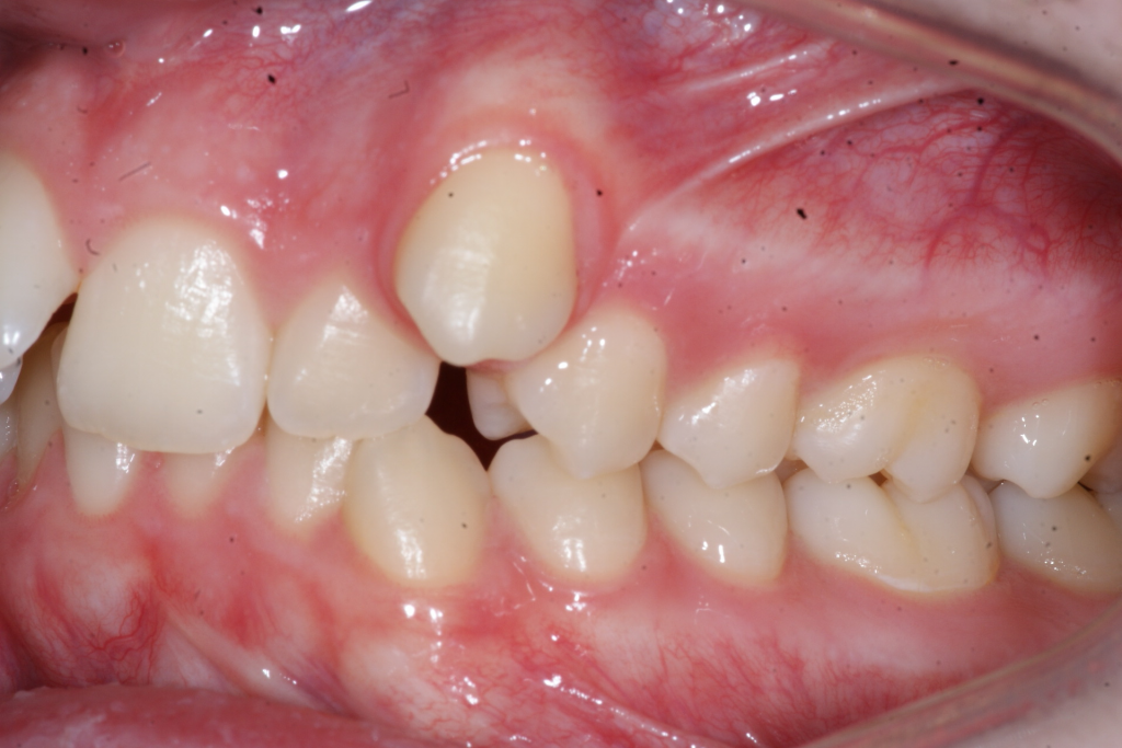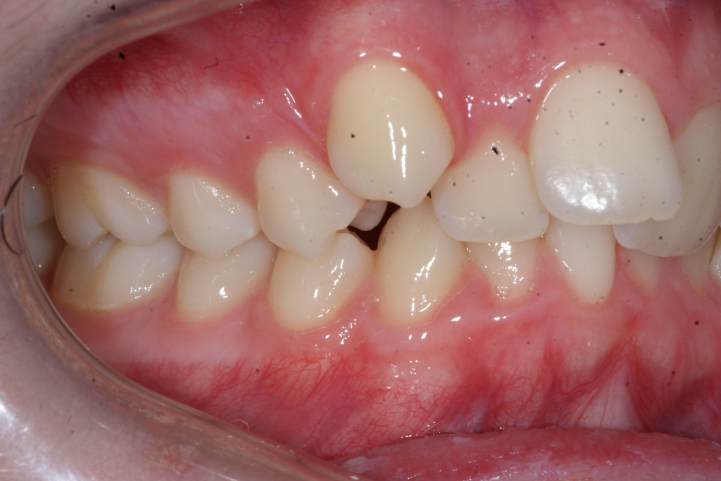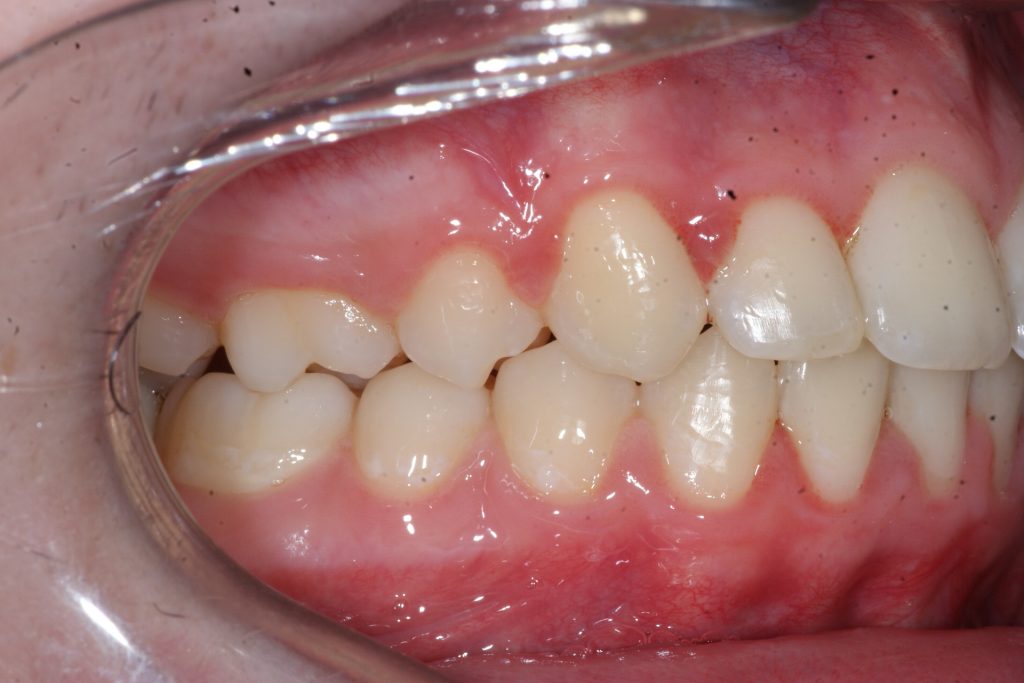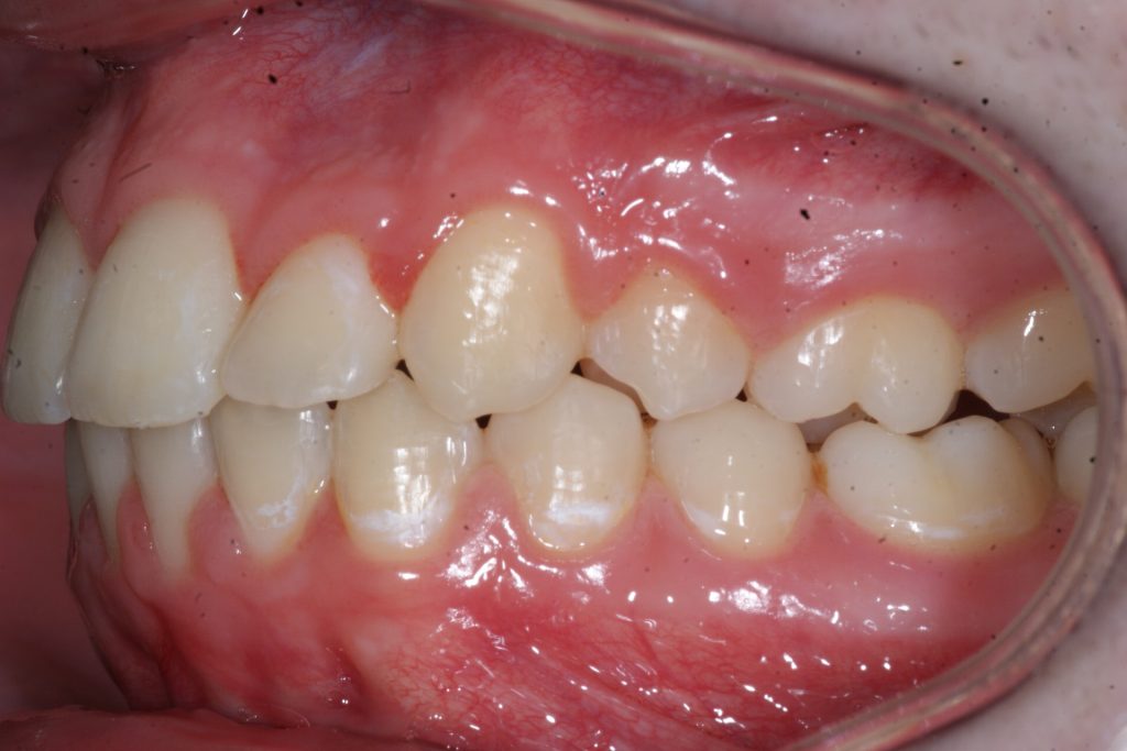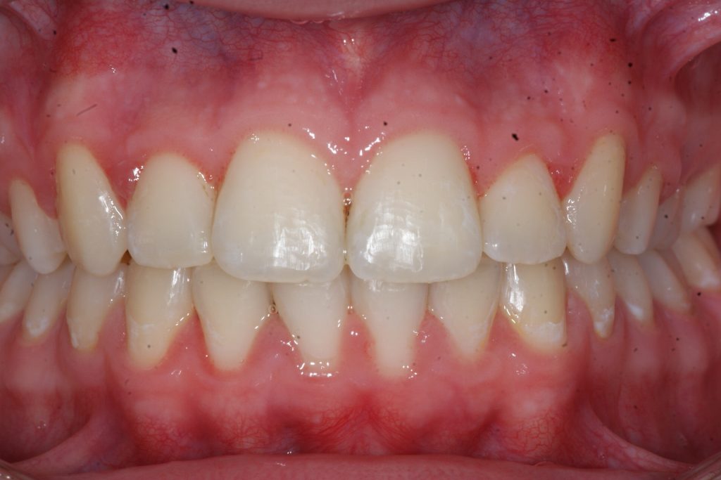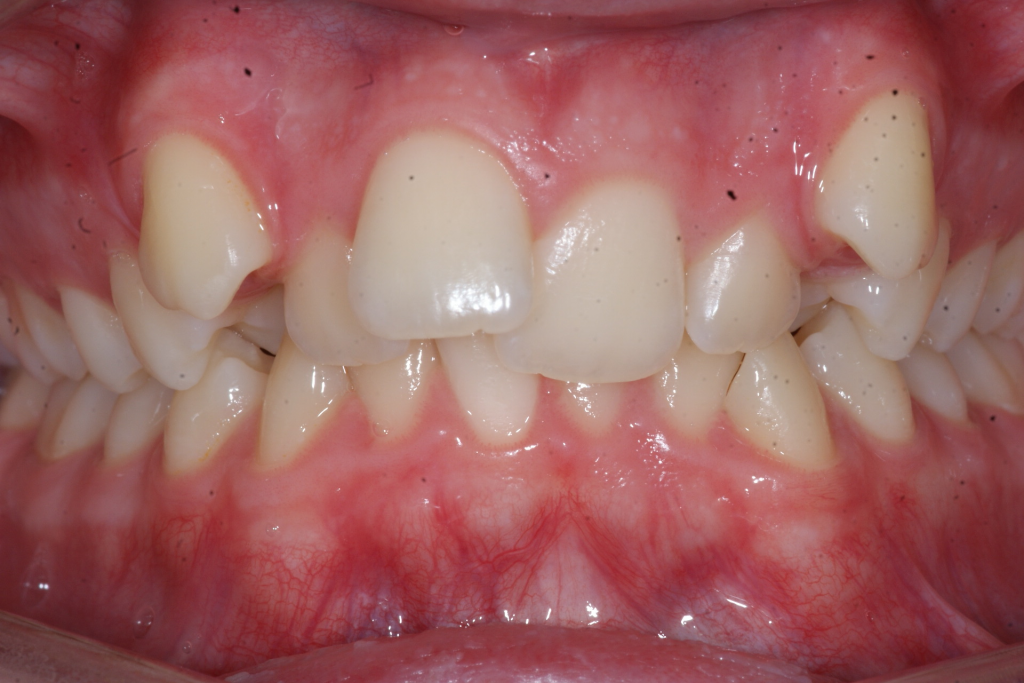Correction d’une malocclusion de type Classe II avec chevauchement sévère à l’arcade supérieure. Des appareils fixes (boîtiers) et l’extraction de 2 prémolaires (#15-25) à l’arcade supérieure furent nécessaires pour améliorer ce sourire. Traitement chez un adolescent, réalisé en 19 mois.