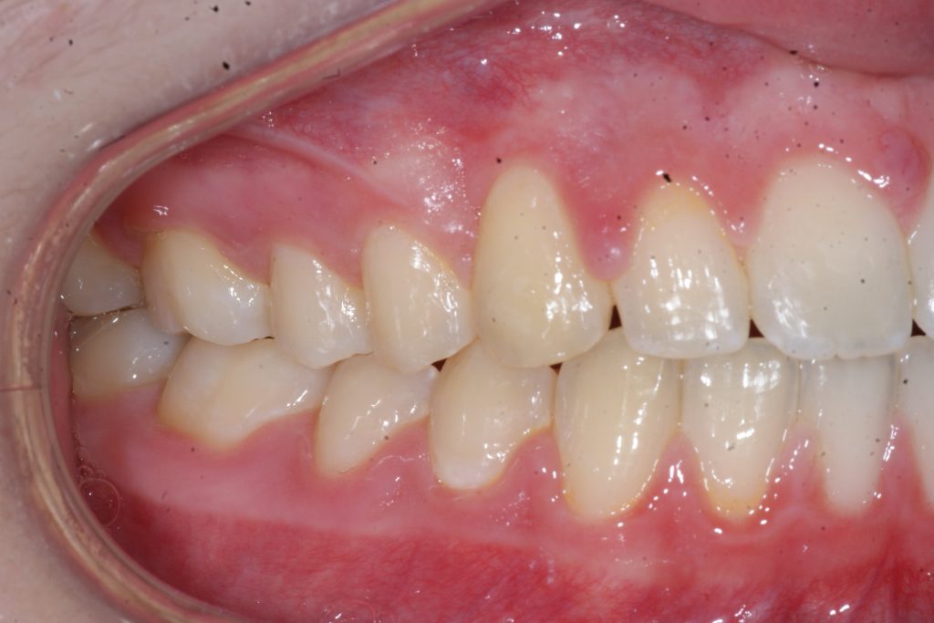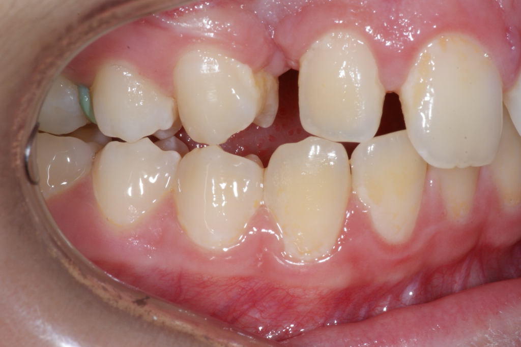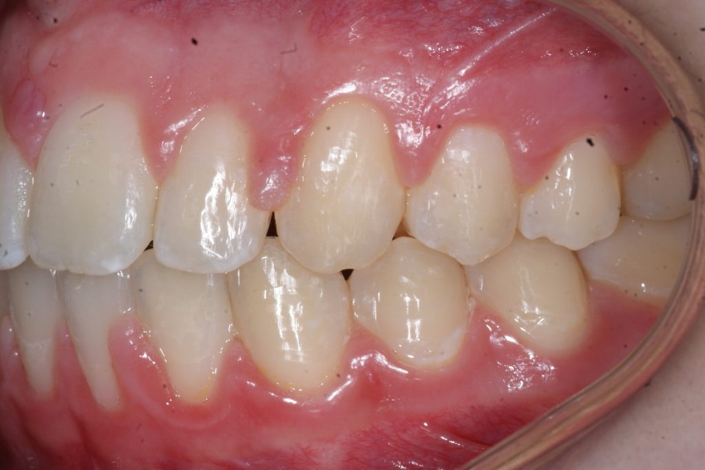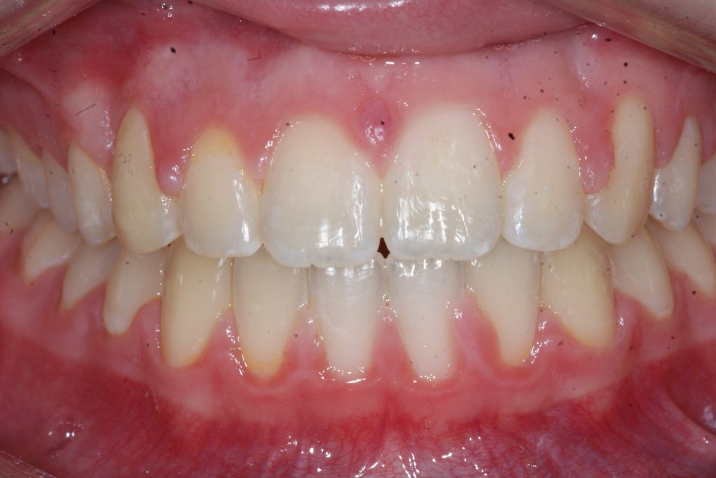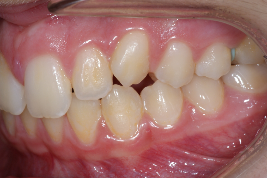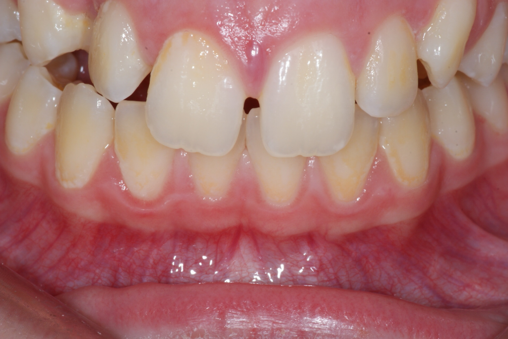 Correction d’une malocclusion de type Classe II, surplombs inadéquats, canine #13 incluse et articulés croisés antérieurs. Des appareils fixes (broches) et une traction de la canine incluse furent nécessaires pour améliorer ce sourire. Traitement chez une adolescente, réalisé en 15 mois
