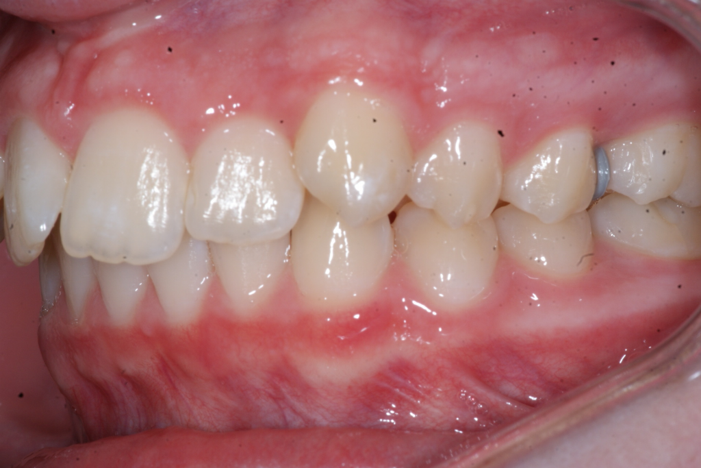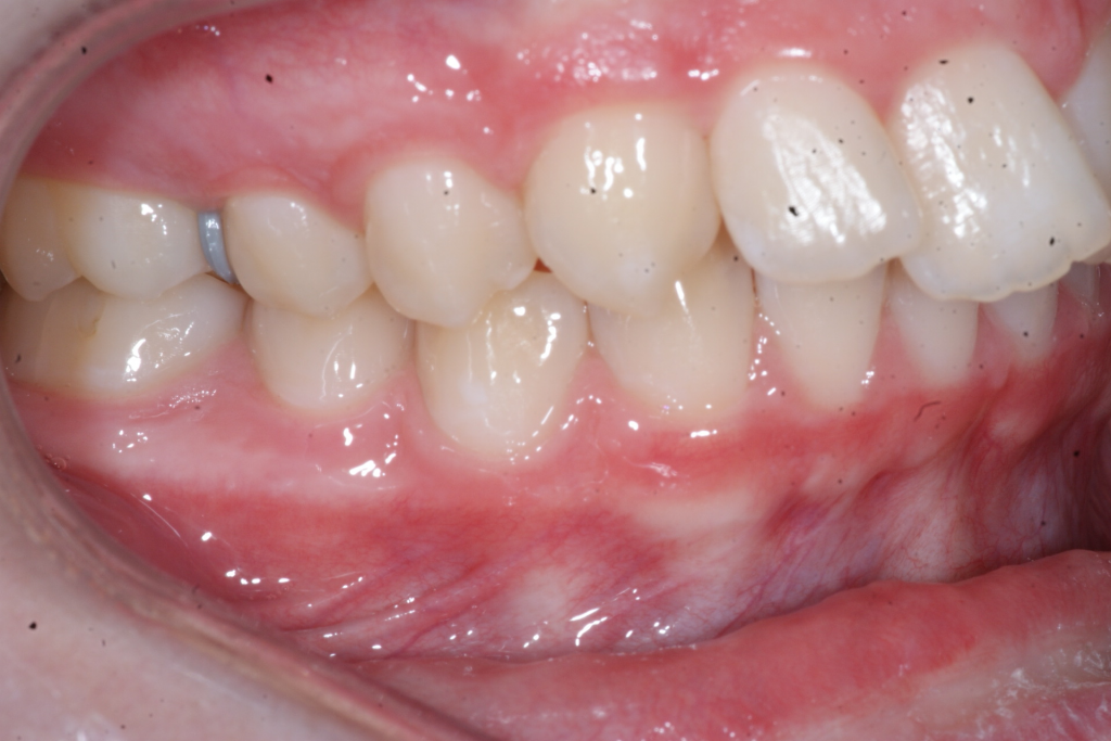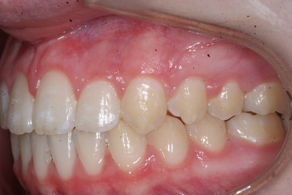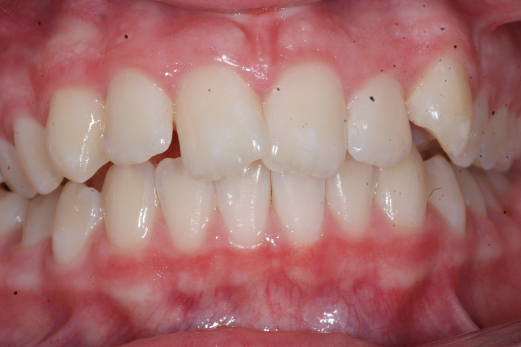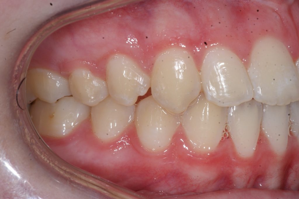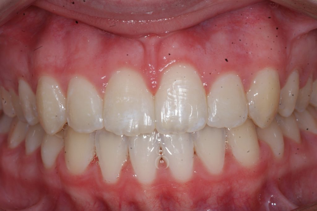 Correction d’une malocclusion de type Classe II division 1. Des appareils fixes (boîtiers) et une expansion palatine furent nécessaires pour améliorer ce sourire. Traitement chez une adolescente, réalisé en 22 mois.
