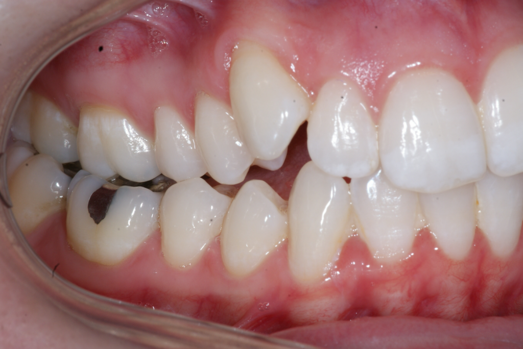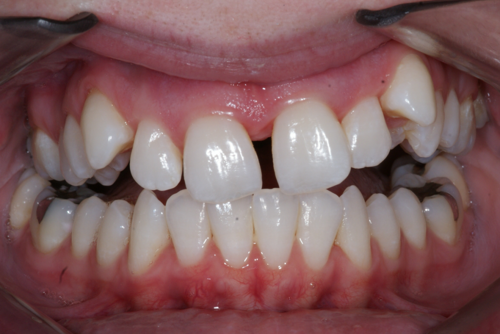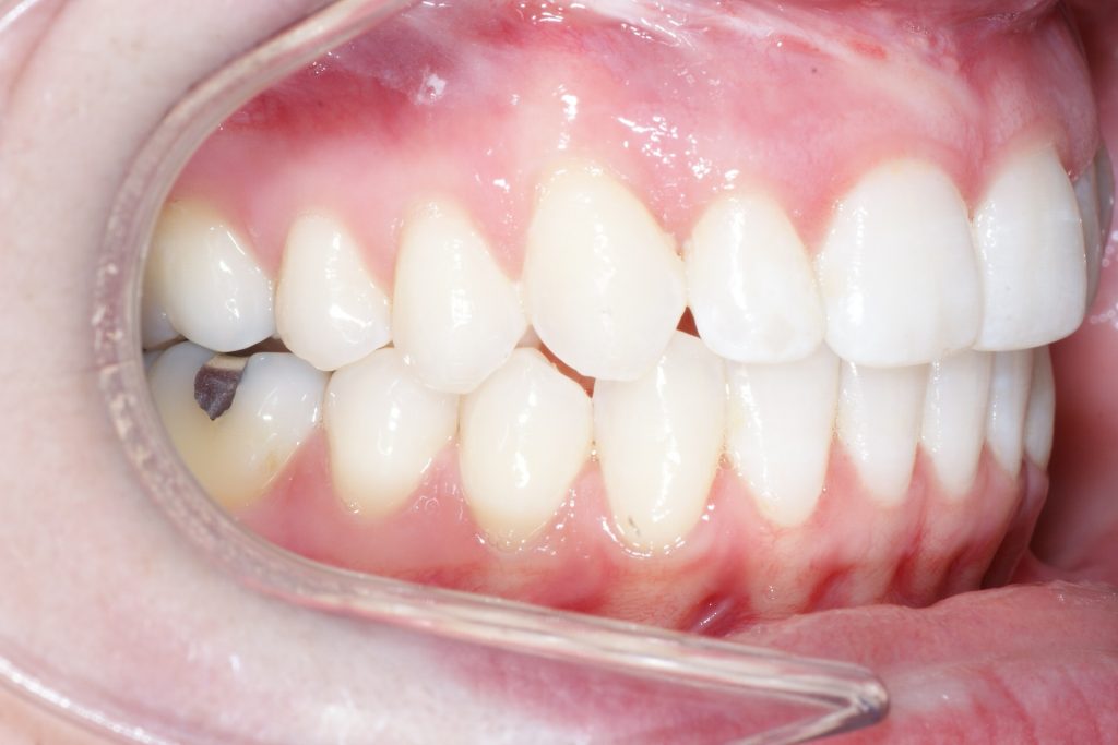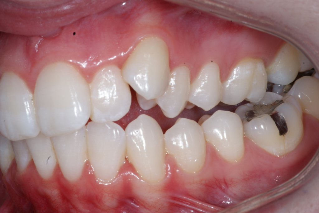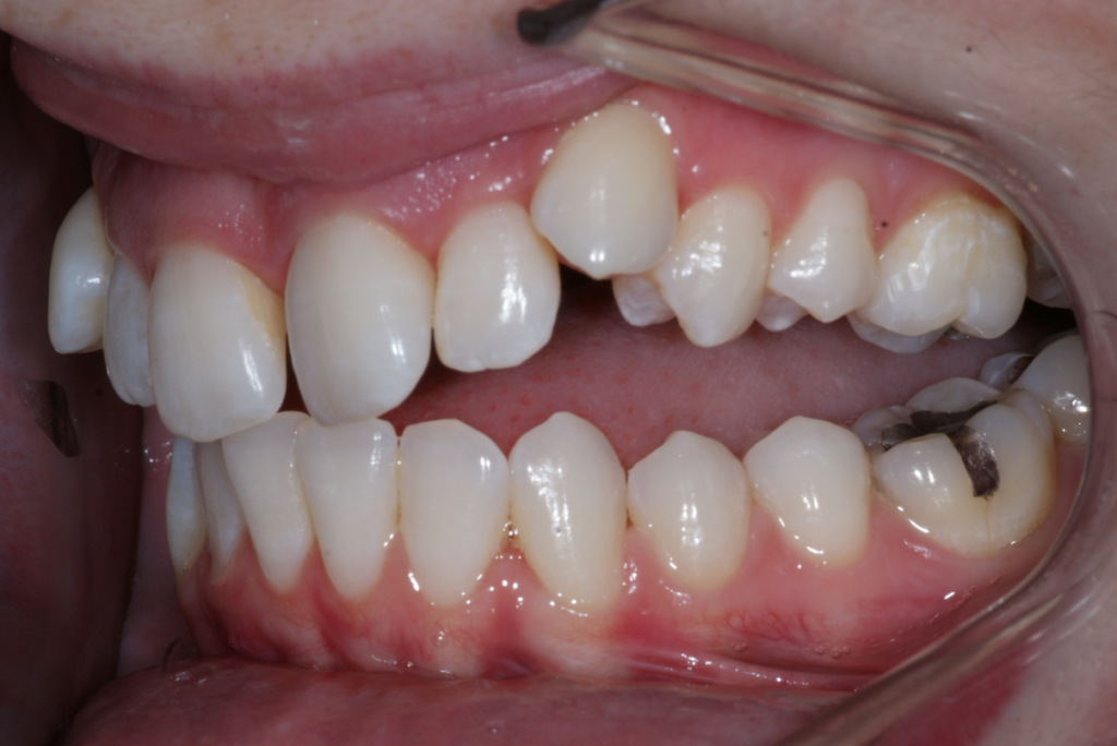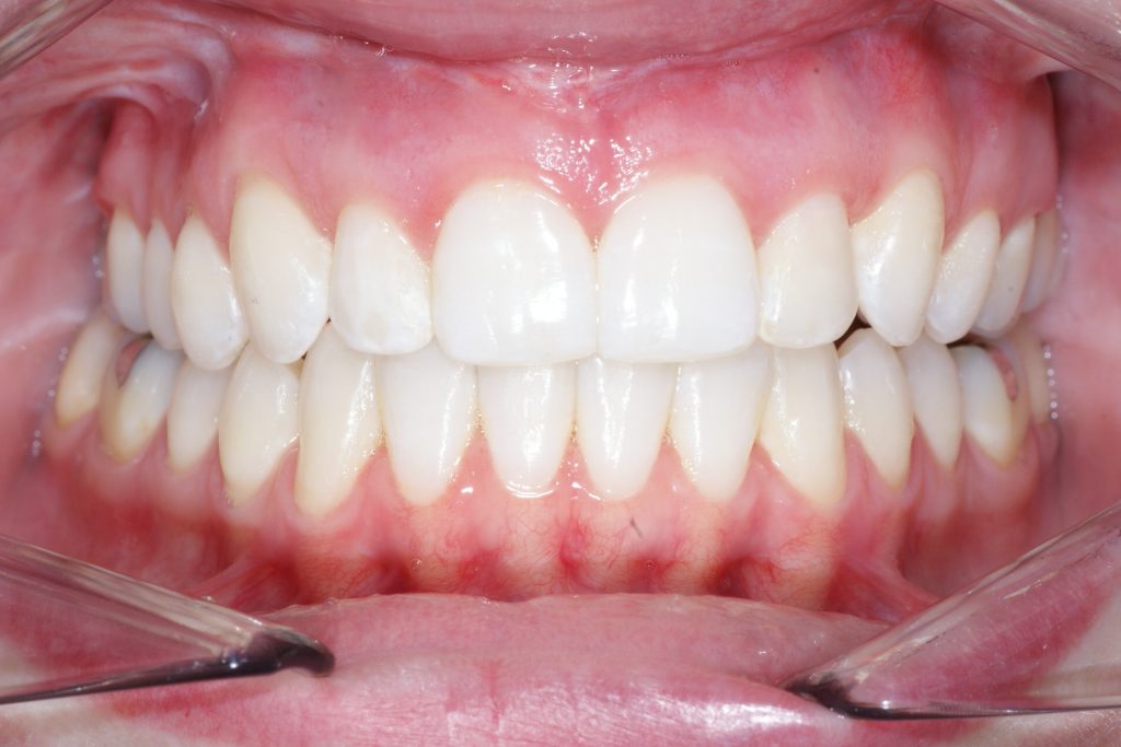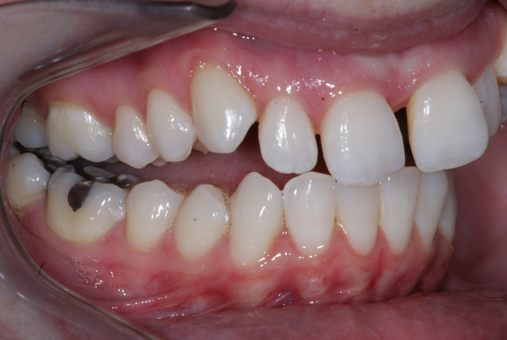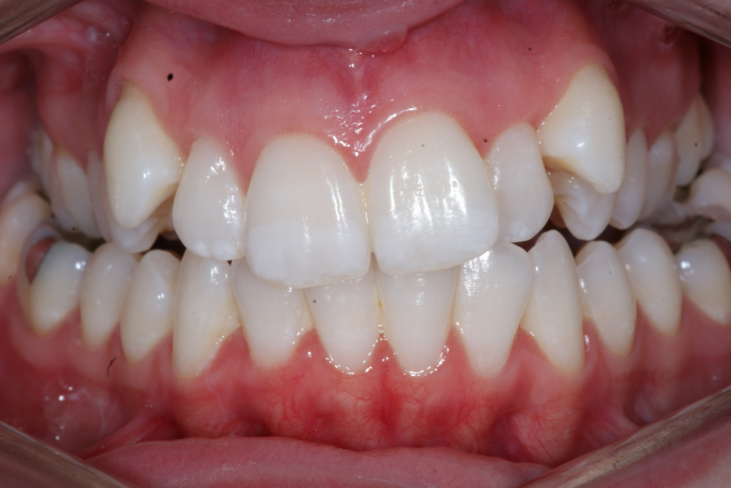 Correction d’une malocclusion de type Classe II subdivision, canines ectopiques, palais constricté, et chevauchement modéré aux 2 arcades. Une expansion palatine assistée chirurgicalement a été réalisée en début de traitement et l’extraction d’une prémolaire supérieure fut aussi nécessaire. Par la suite, 85 coquilles Invisalign®, réparties en 3 séries, nous ont permis d’améliorer ce sourire. Traitement chez une jeune adulte réalisé en 21 mois.