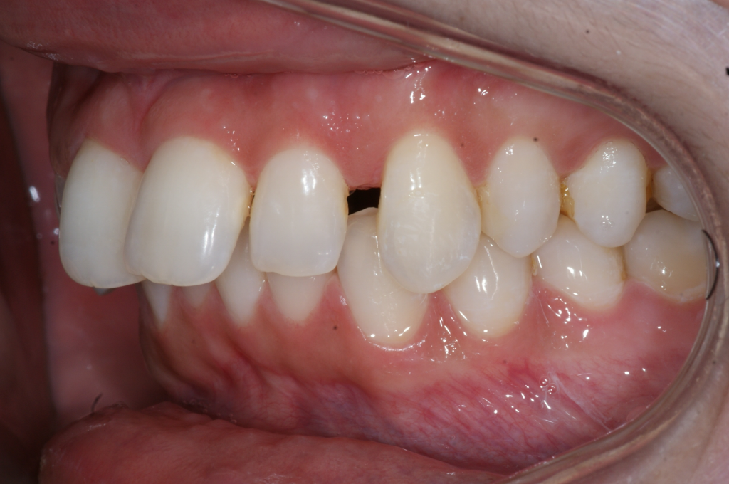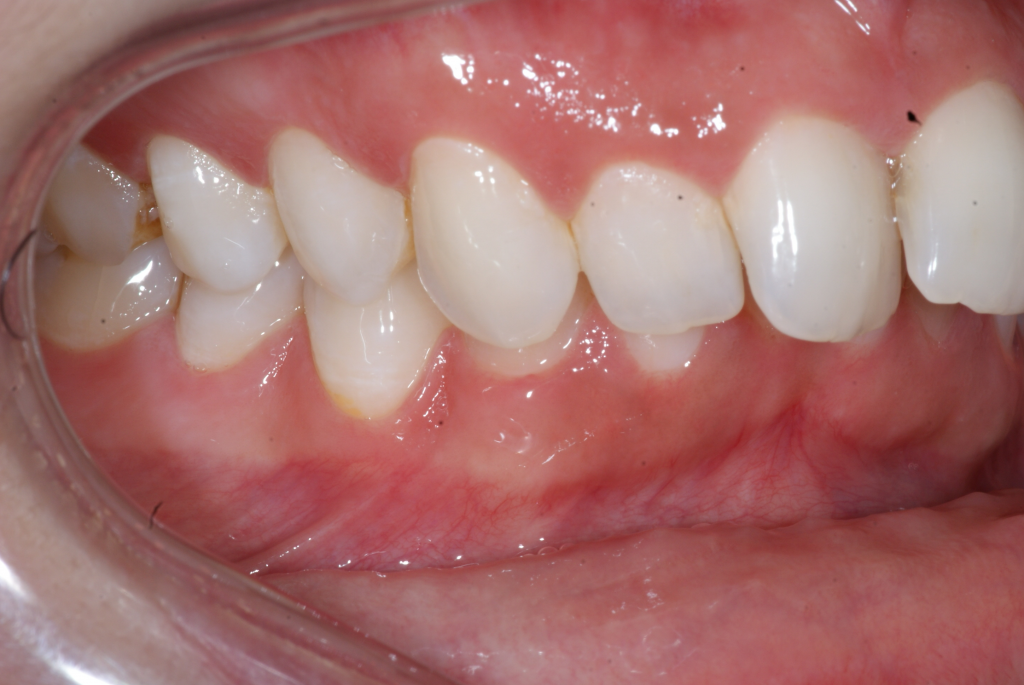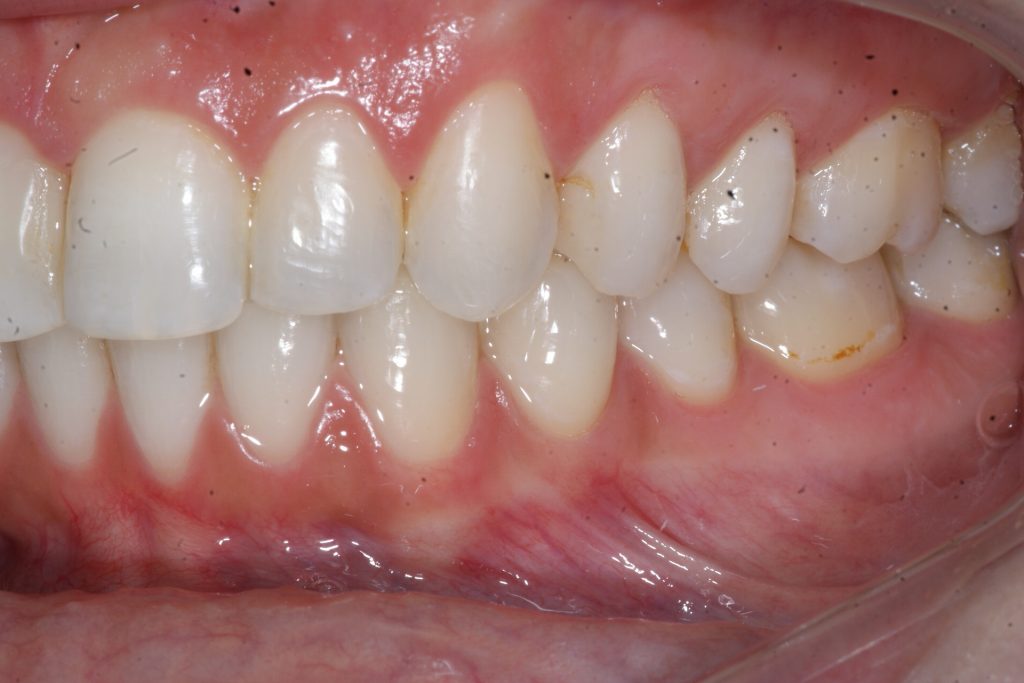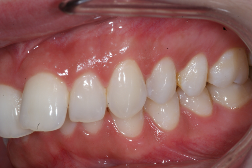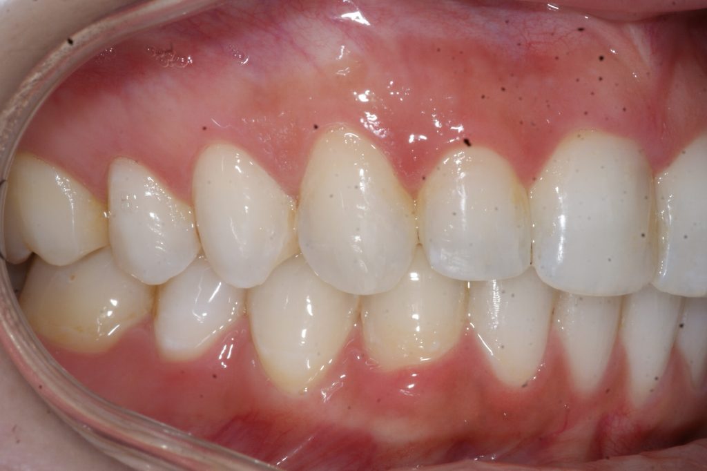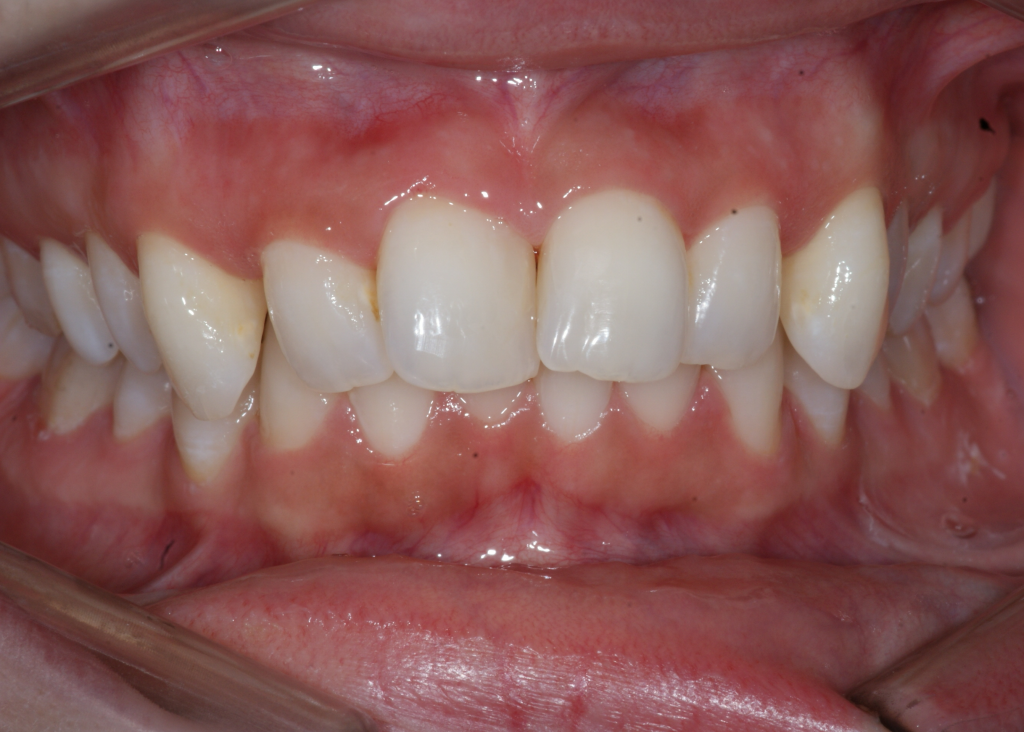 Correction d’une malocclusion de type Classe II division 2 et surplombs inadéquats. Un appareil Carriere® et 85 coquilles Invisalign® furent nécessaires pour améliorer ce sourire. Traitement chez une jeune adulte réalisé en 24 mois.