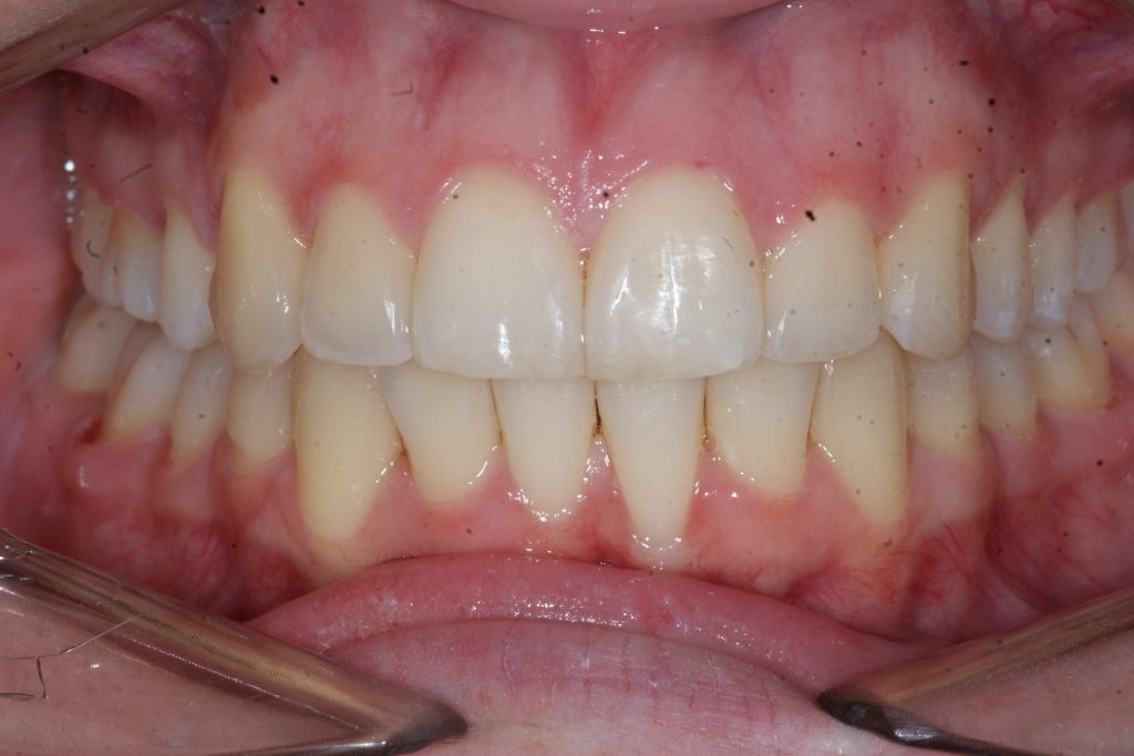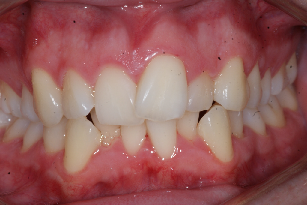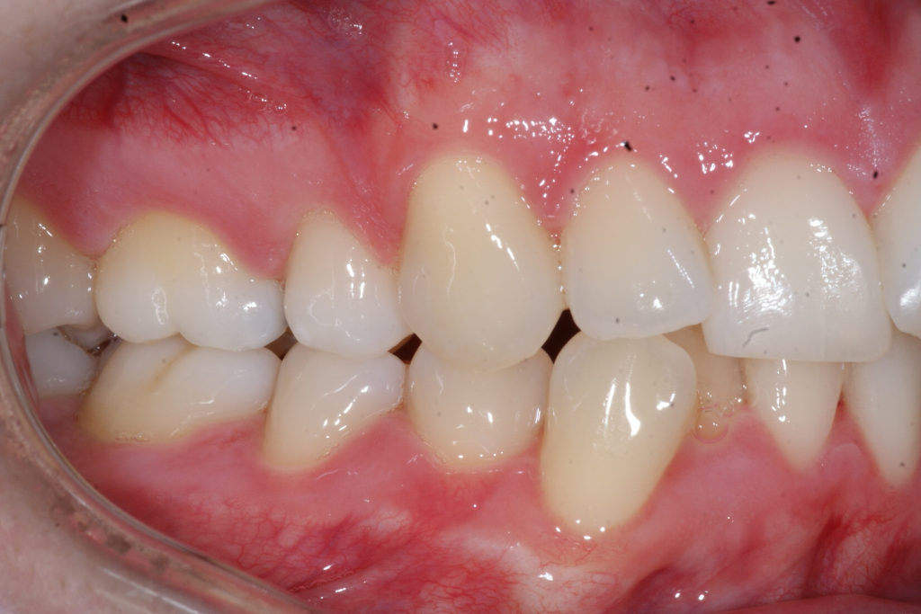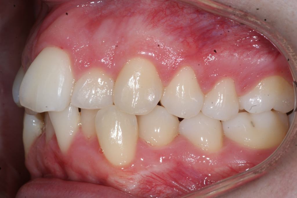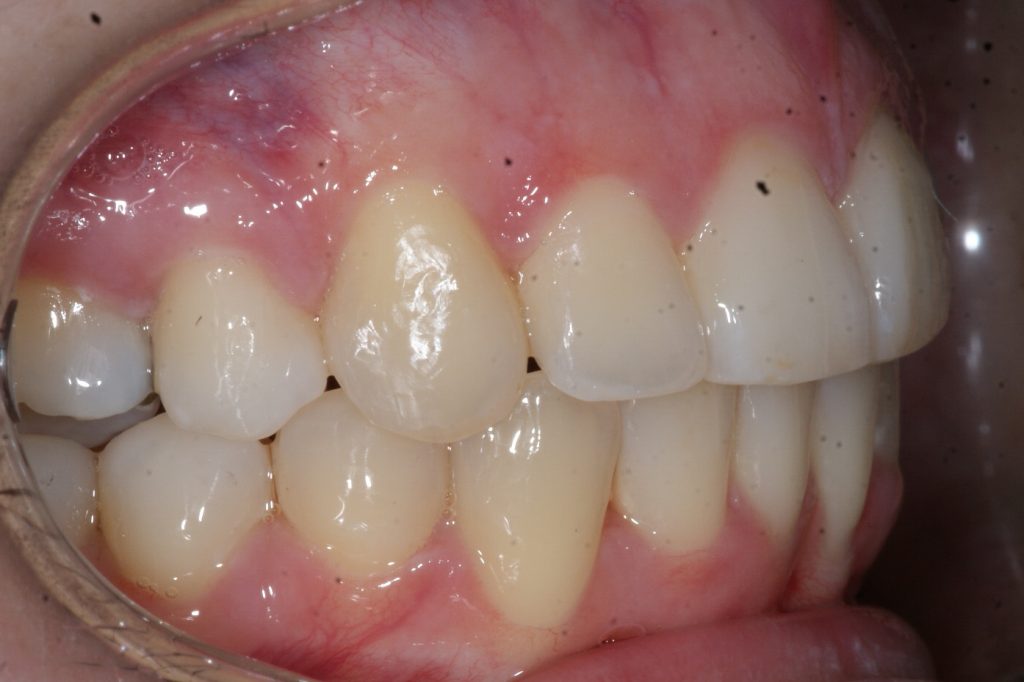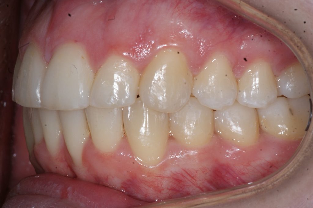 Correction d’une malocclusion de type Classe II subdivision et surplombs inadéquats. 64 coquilles Invisalign® et l’extraction d’une prémolaire à l’arcade supérieure (#14) furent nécessaires pour améliorer ce sourire. Traitement chez une jeune adulte, réalisé en 20 mois.