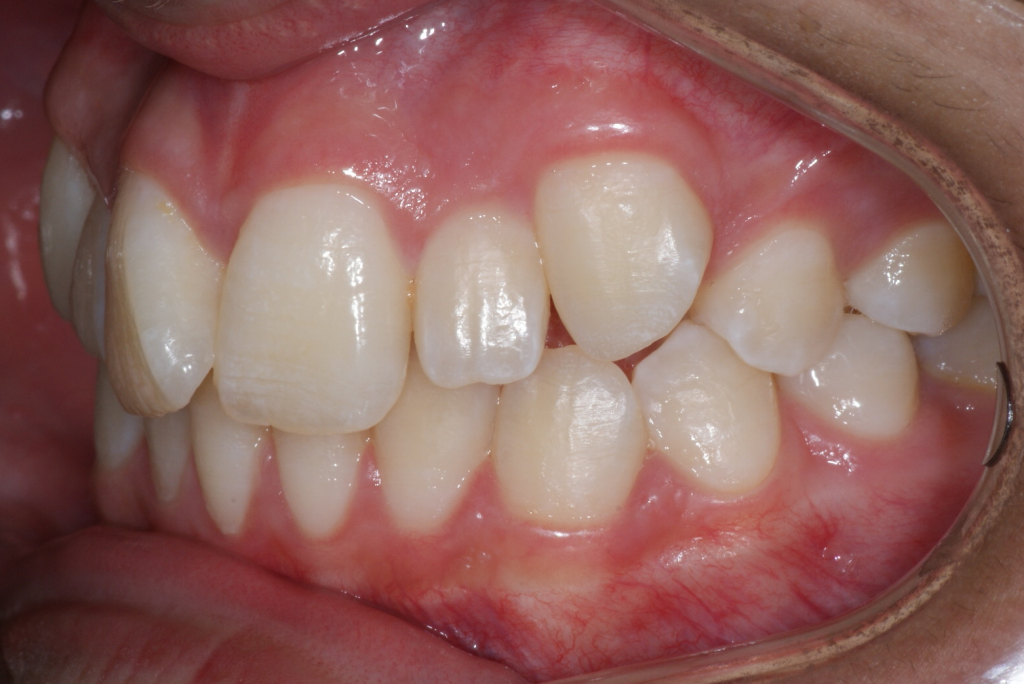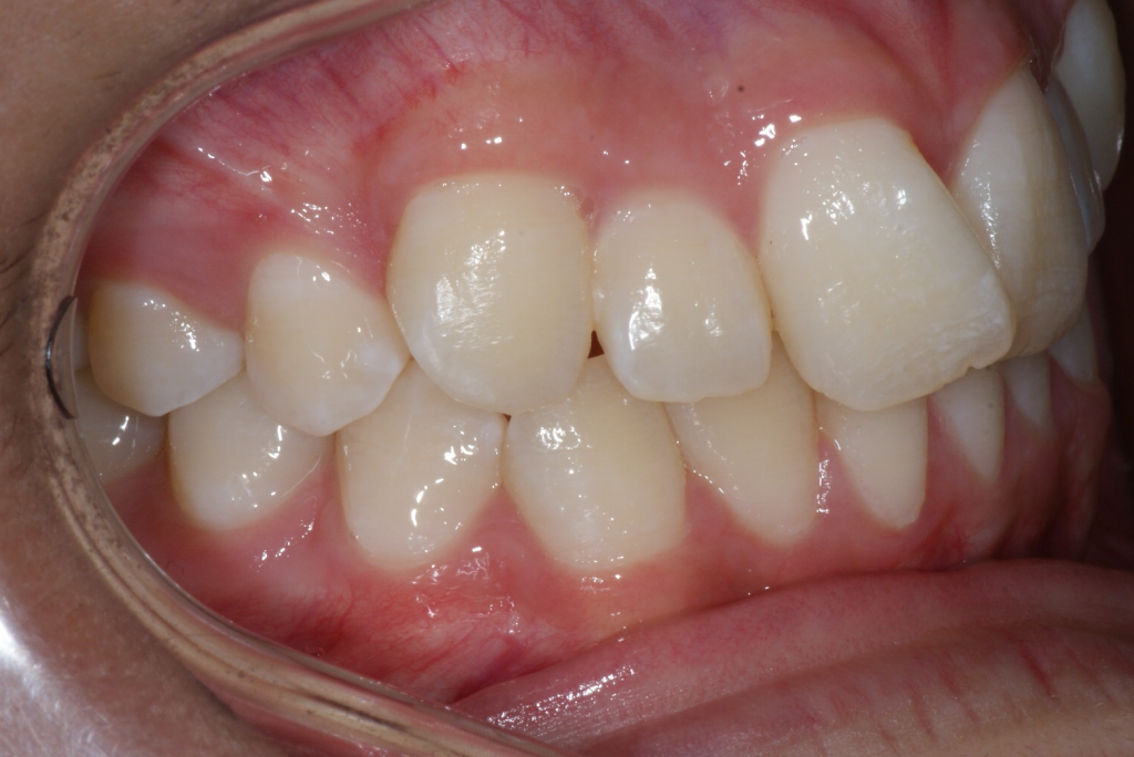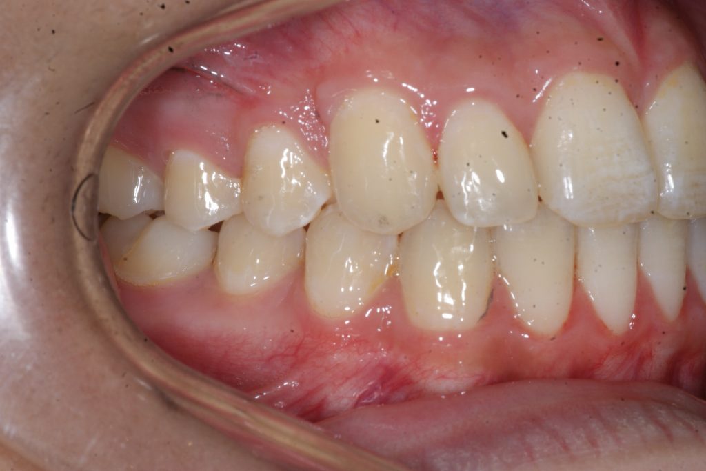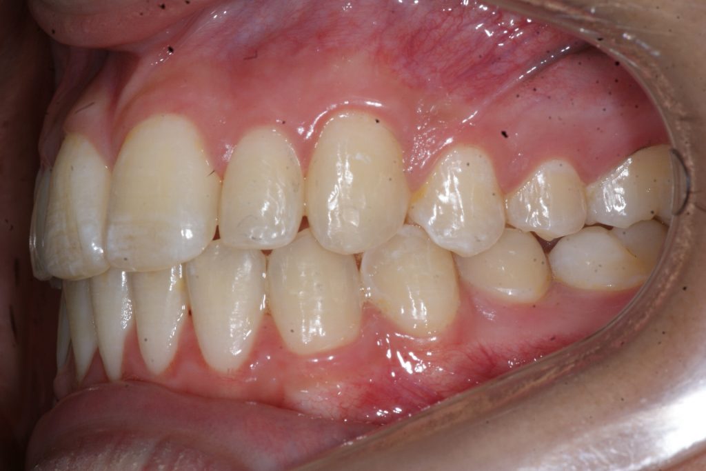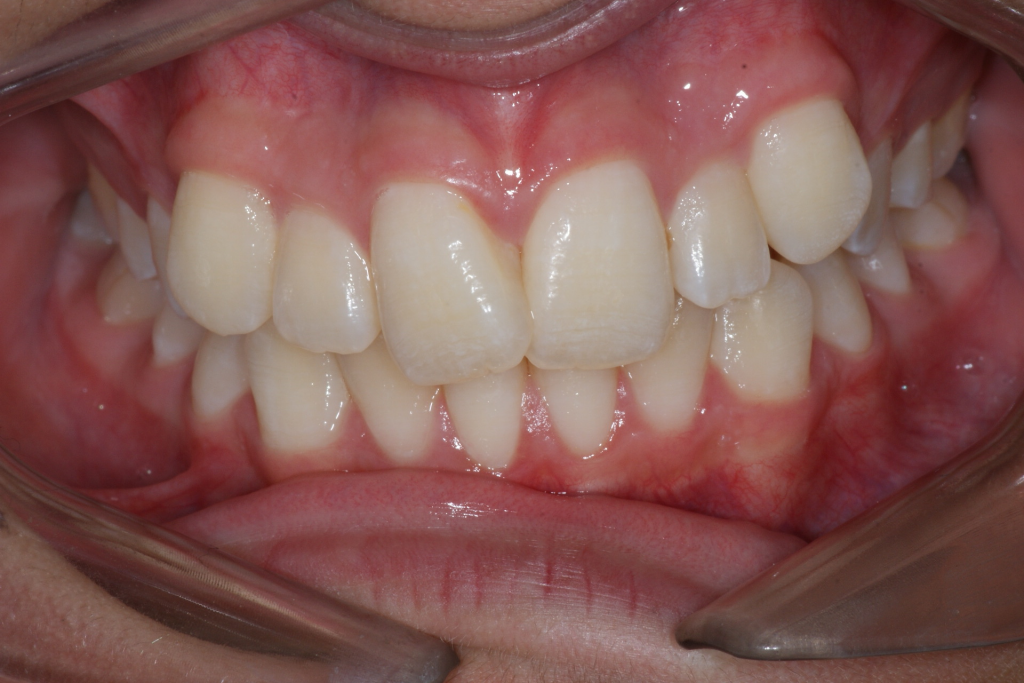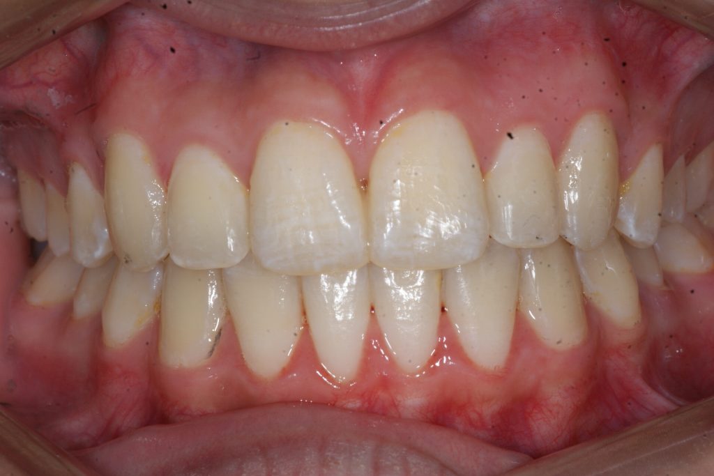 Correction d’une malocclusion de type Classe I avec chevauchement modéré aux 2 arcades. Des appareils amovibles (coquilles Invisalign®) furent nécessaires pour améliorer ce sourire. Traitement chez une adolescente, réalisé en 21 mois.