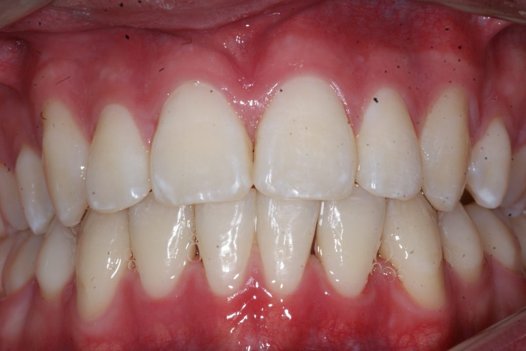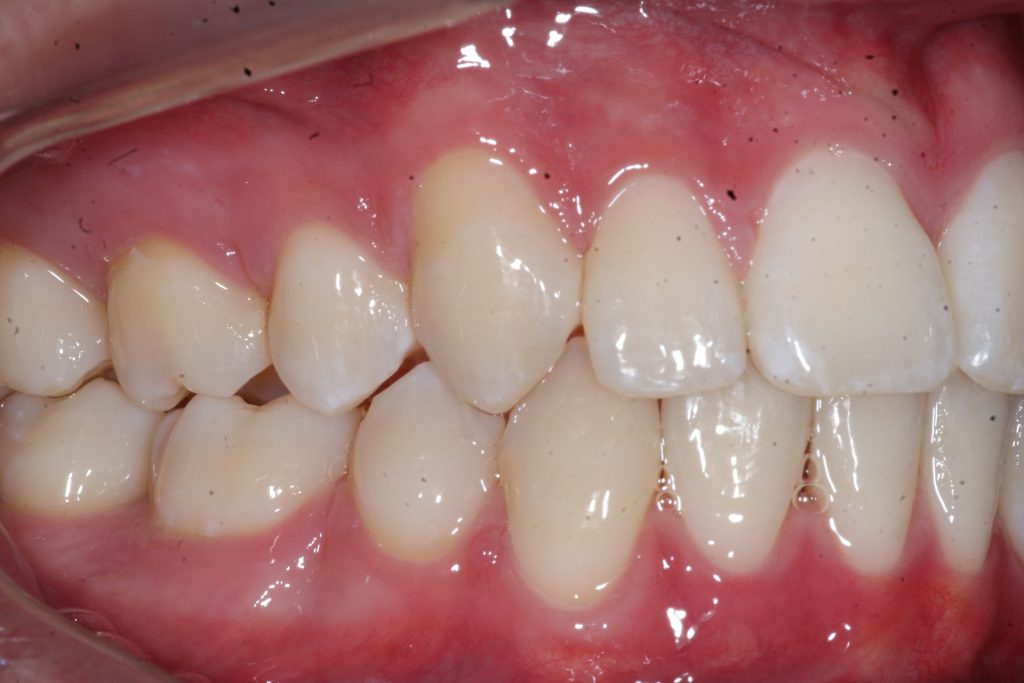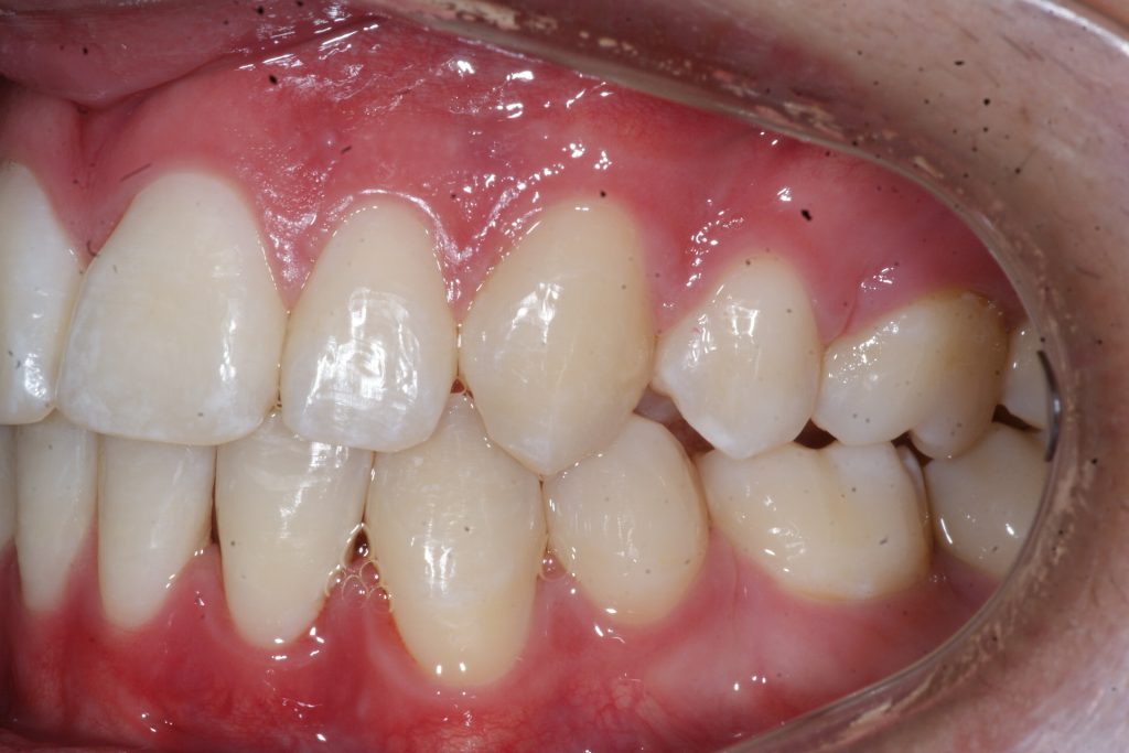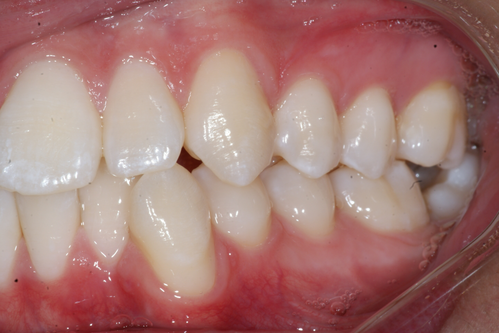 Correction d’une malocclusion de type bimax, canine #33 ectopique et chevauchement léger aux 2 arcades. Des appareils fixes (broches) et extraction de 4 prémolaires furent nécessaires pour améliorer ce sourire. Traitement chez un jeune adulte, réalisé en 28 mois.