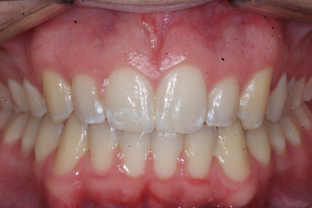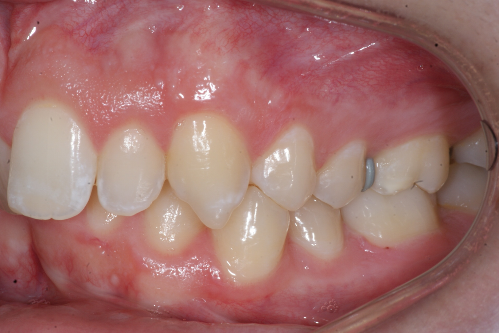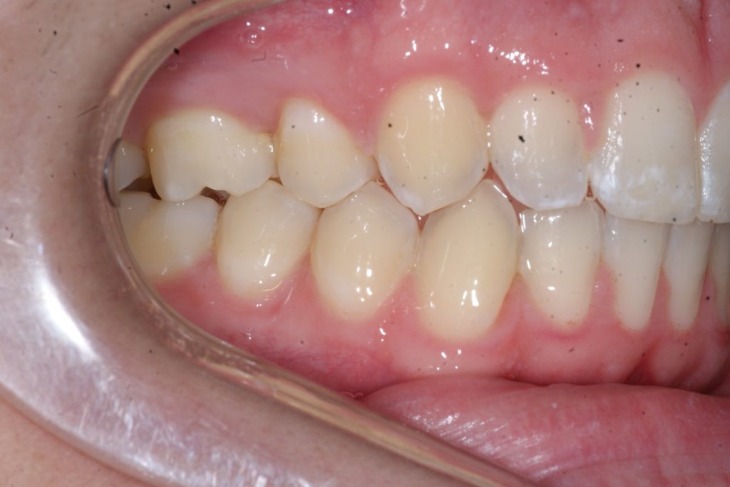 Correction d’une malocclusion de type Classe II subdivision avec surplombs prononcés et chevauchement modéré aux 2 arcades. Des appareils fixes (boîtiers), une expansion palatine et l’extraction d’une prémolaire (#14) furent nécessaires pour améliorer ce sourire. Traitement chez un adolescent, réalisé en 29 mois.