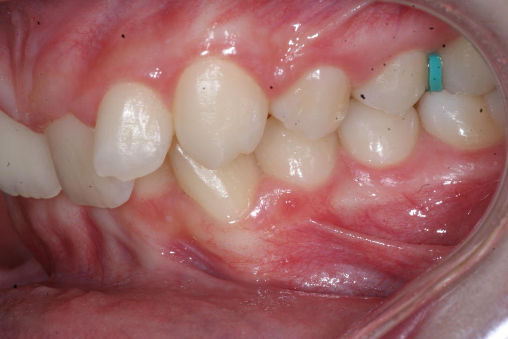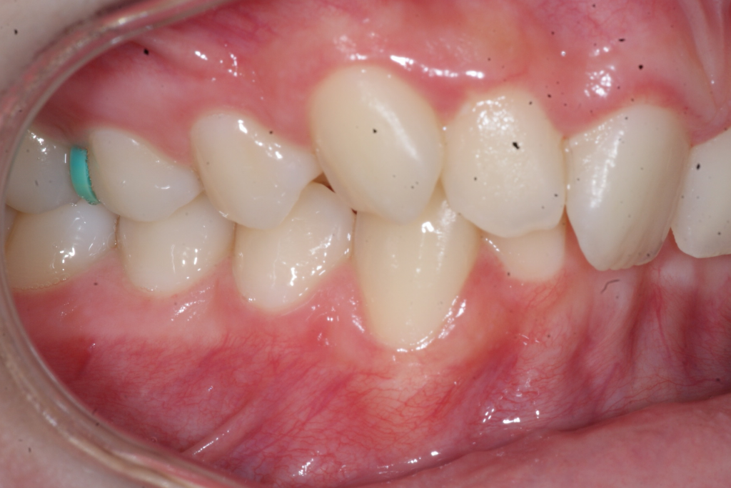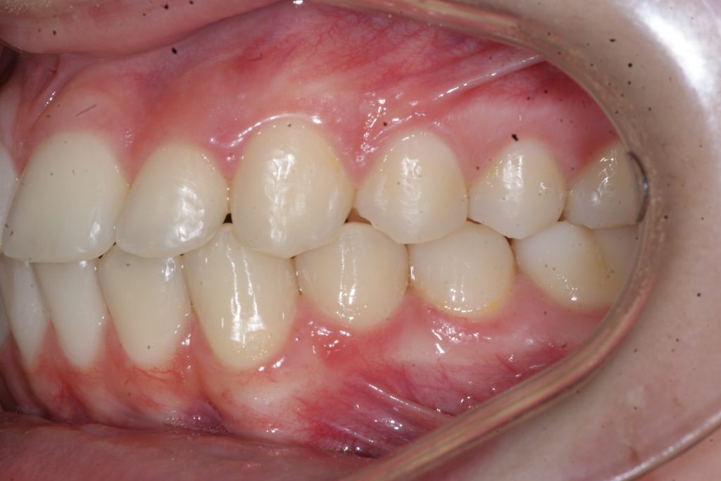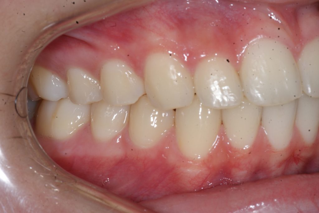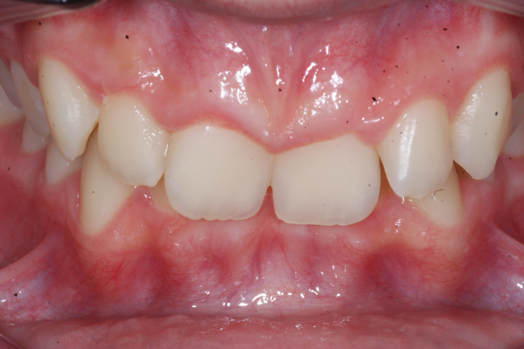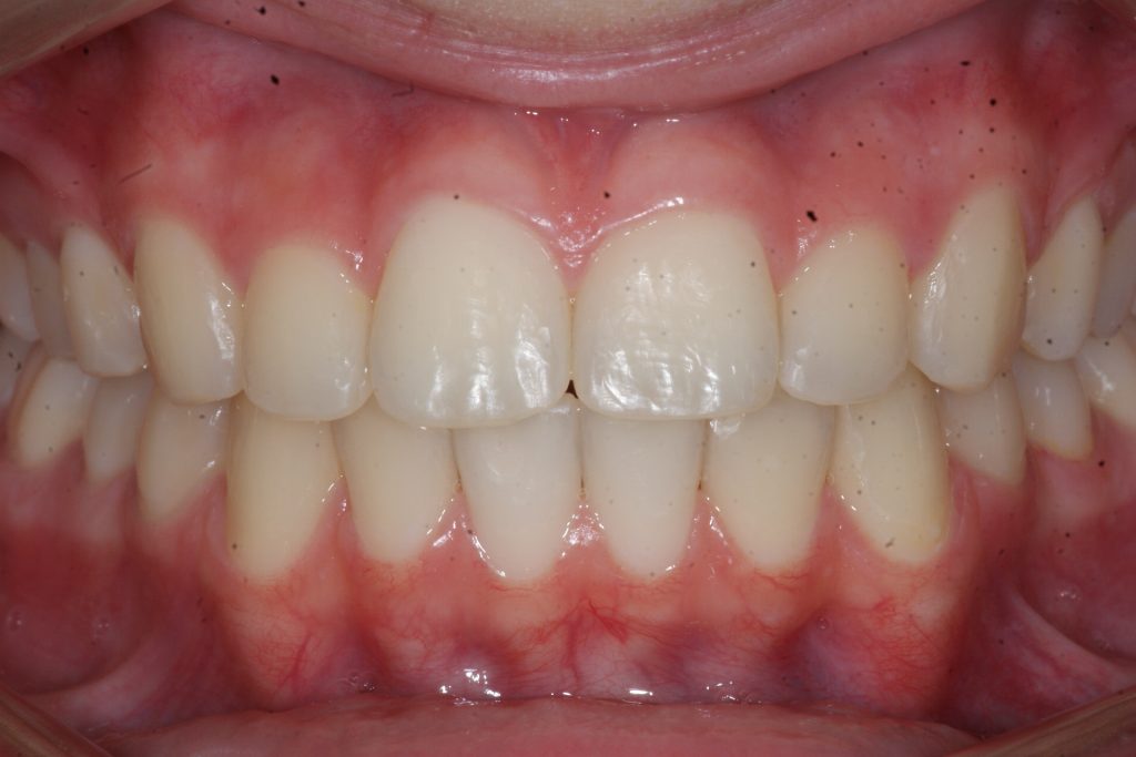 Correction d’une malocclusion de type Classe II division 2. Des appareils fixes (boîtiers) ainsi qu’une expansion palatine furent nécessaires pour améliorer ce sourire. Traitement chez une adolescente réalisé en 21 mois.