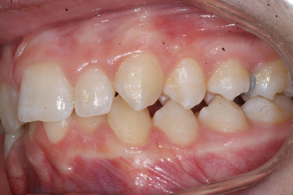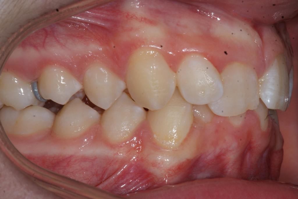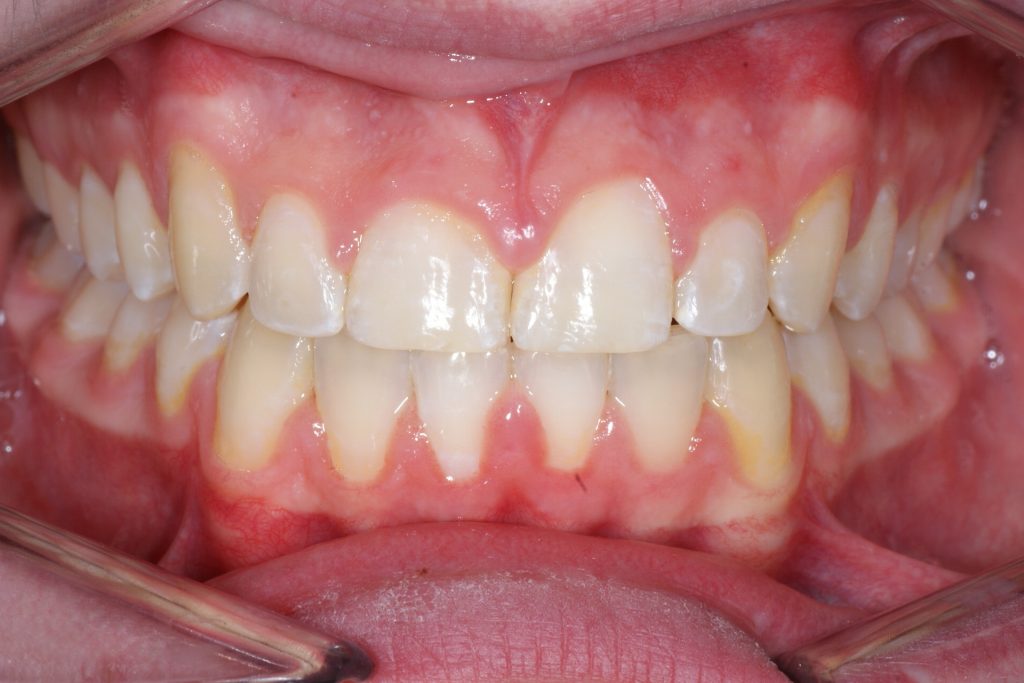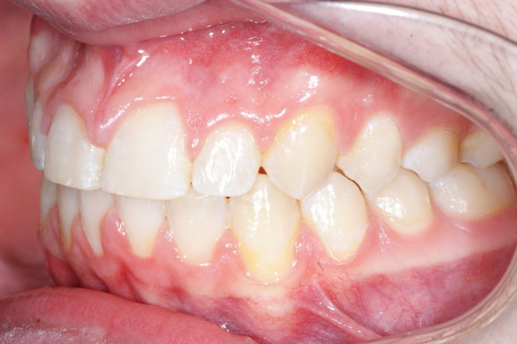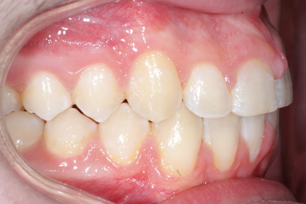 Correction d’une malocclusion de type Classe II. Des appareils fixes (boîtiers) ainsi qu’une expansion palatine furent nécessaires pour améliorer ce sourire. Traitement chez un adolescent réalisé en 20 mois.