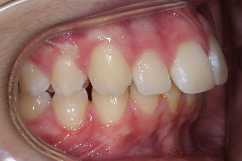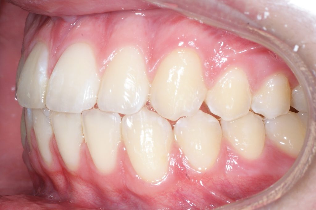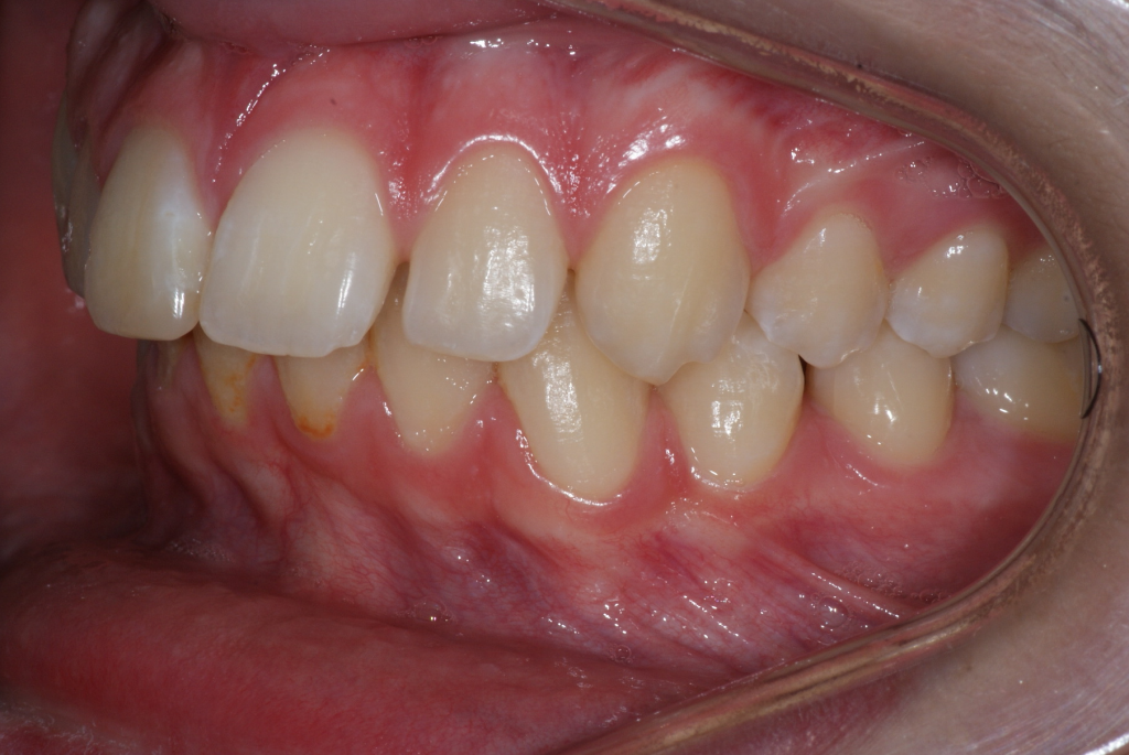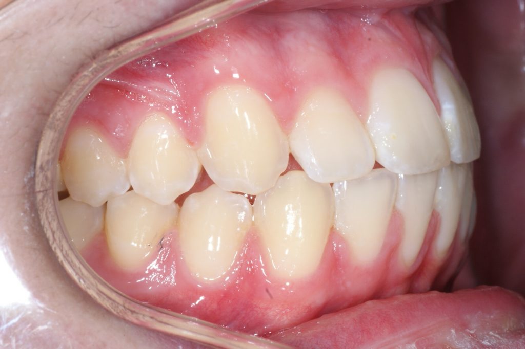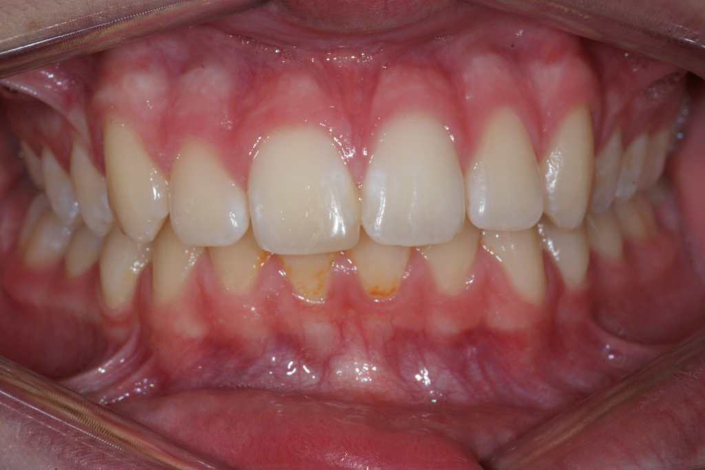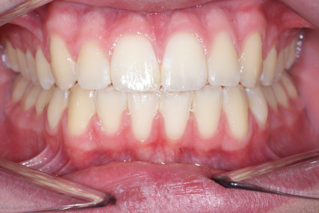 Correction d’une malocclusion de type Classe II division 2 avec manque transverse. Des appareils fixes (boîtiers) ainsi qu’une expansion palatine furent nécessaires pour améliorer ce sourire. Traitement chez un adolescent, réalisé en 23 mois.