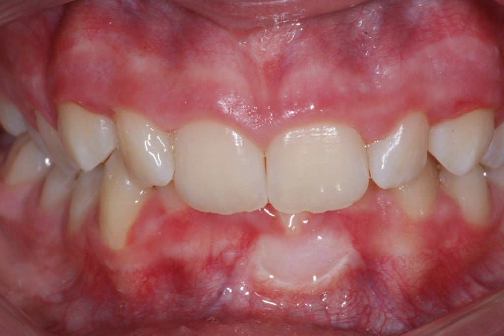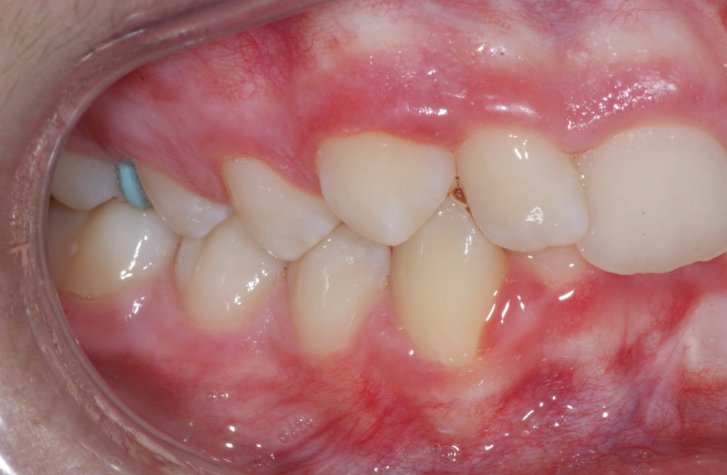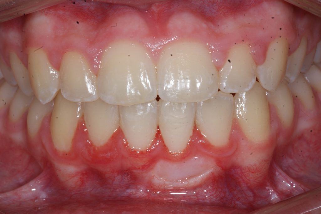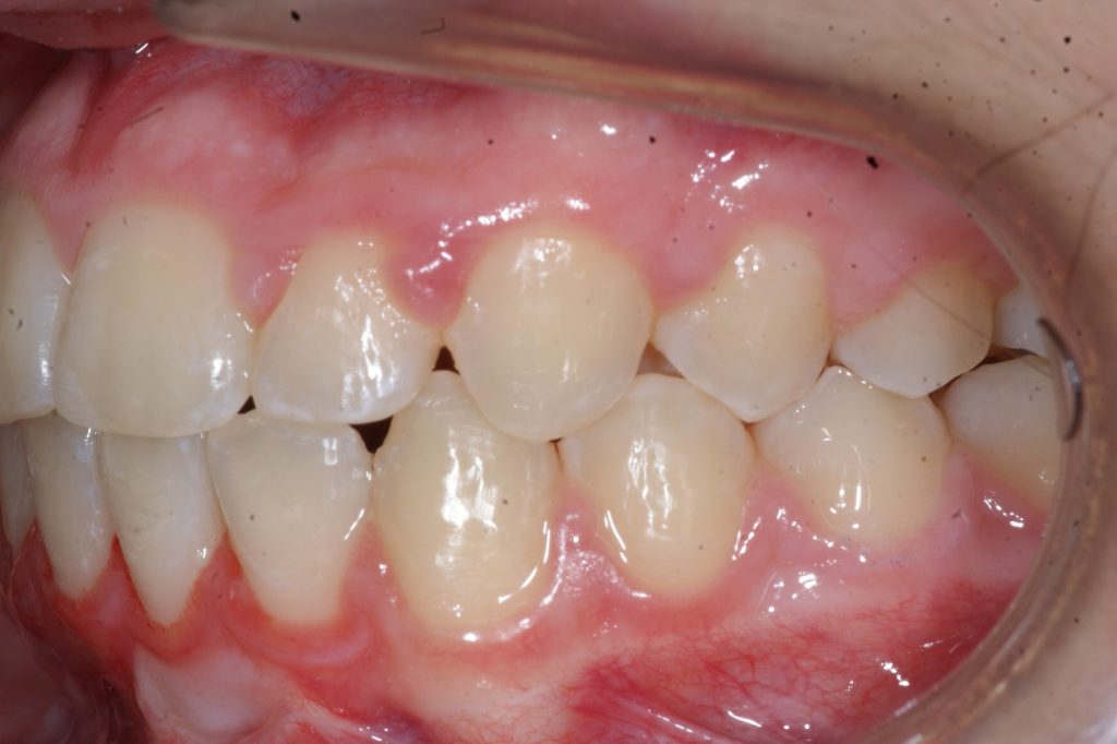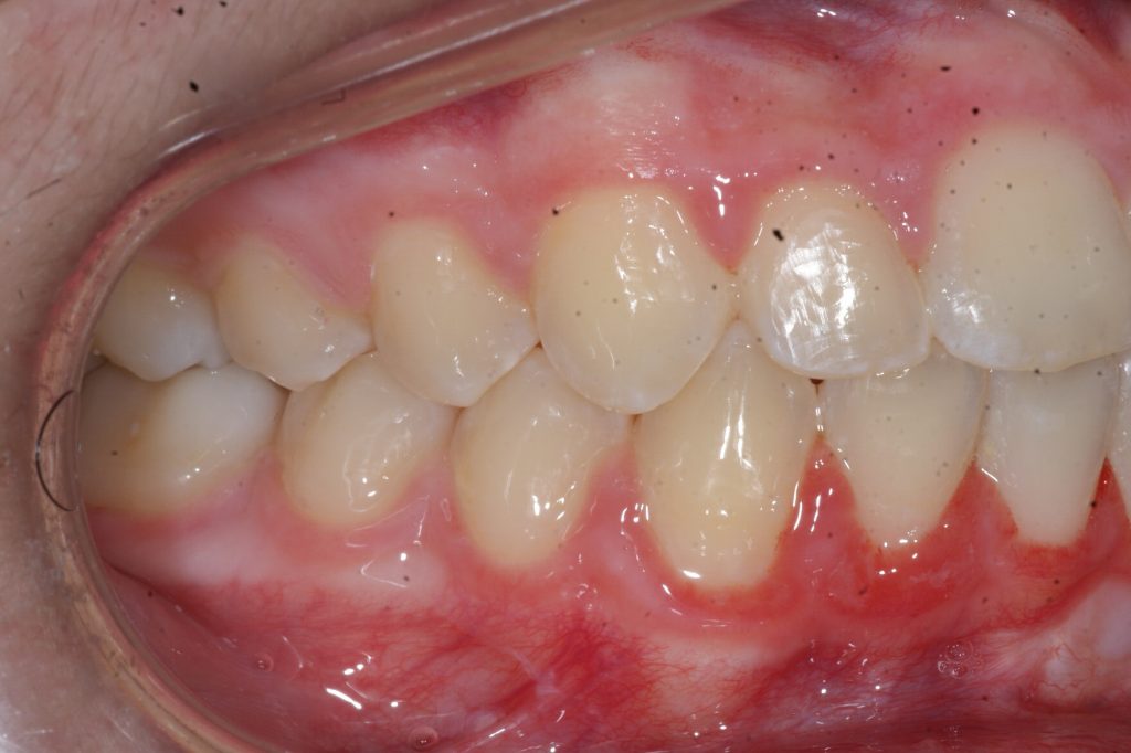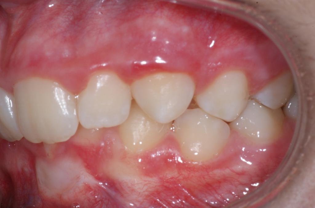 Correction d’une malocclusion de type Classe I. Des appareils fixes (boîtiers) furent nécessaires pour améliorer ce sourire. Traitement chez une adolescente, réalisé en 22 mois.